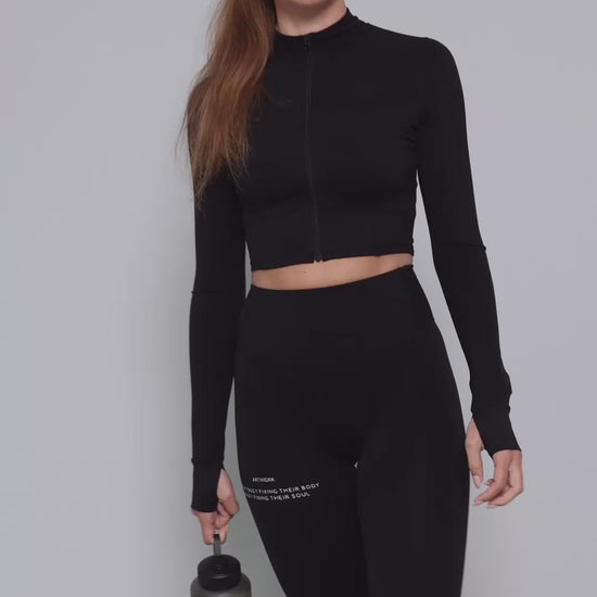 The 11Attention Full Zip Cropped Blouse is built for performance with a sharp, streamlined look. Black, long-sleeve design with thumbholes and a high collar for extra coverage. Full front zip for easy layering and adjustable airflow.