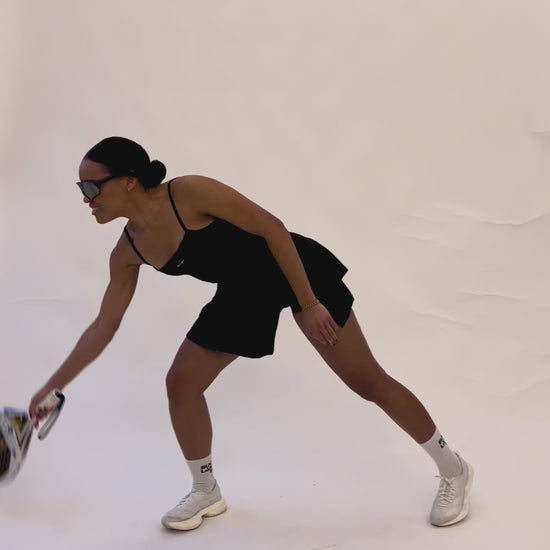 A sleek and performance-driven sports dress designed for women who move with focus and intention. The dress features a fitted upper construction with thin adjustable straps, integrated inner shorts, and a flared skirt — creating a clean, balanced silhouette built for training, movement and everyday active flow.